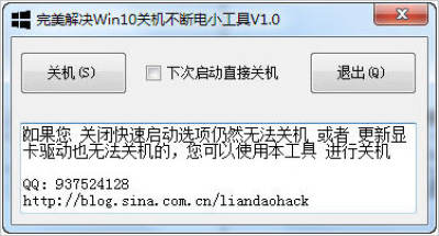 使用win10的用户都知道,win10关机后电源灯还是亮着的。使用这个完美解决Win10关机不断电小工具可以完美解决一些笔记本的win10系统关机不断电的问题。如果您关闭快速启动选项仍然无法关机,或者更新显卡驱动也无法关机的,您可以使用本工具进行关机。