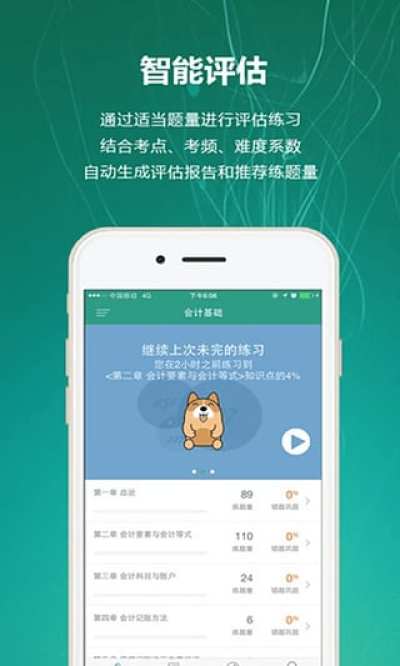 会计练题狗APP是一款会计考试必备的复习备考软件。通过不断的评估练习,详细的了解用户的各考点的掌握情况,从而安排有针对性的练习题目。