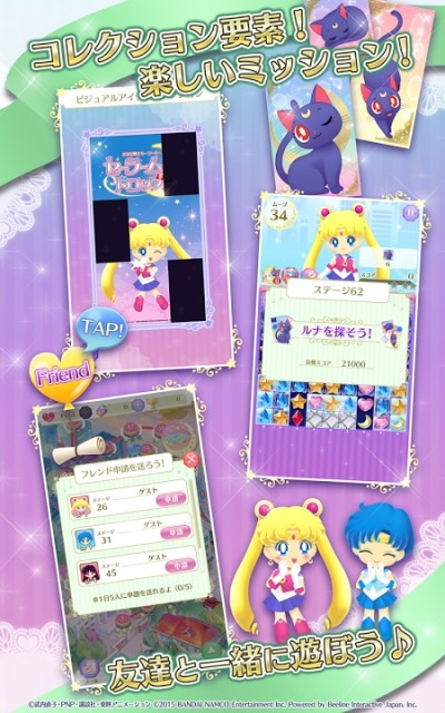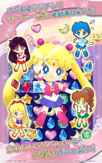 本作是以《美少女战士》为主题首次上架游戏,在游戏中可以看到怀念的水手服战士们的可爱必杀技,是一款简单操作的动作三消游戏。在游戏中一边消除一边与熟悉的水手服美少女战士重逢,也可以感受当年风靡一时的美少女战士的故事。