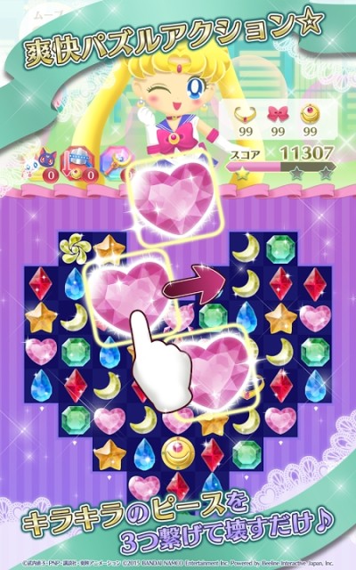 游戏玩法上十分简单,和常见的滑动消除手游类似,通过滑动把3个以上的宝石集合起来即可消除,与此同时美少女战士们会释放出爽快的必杀技。随着舞台的推进,还能收集到原创手机壁纸等多种元素。