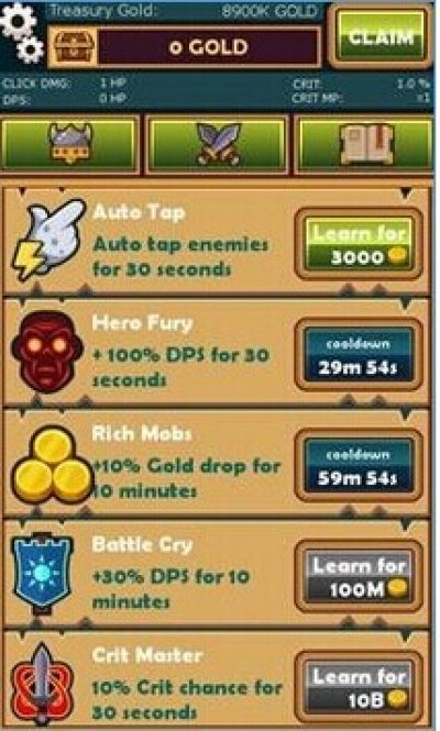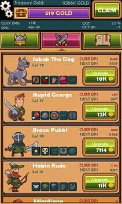 点击冒险是一款玩法非常休闲的RPG手游,游戏以点击为主要玩法,通过点击玩家可以获得金钱,使用金钱来增强和升级自己的能力,赶快加入一起闯关吧。