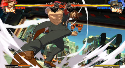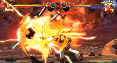 对于像小编这样习惯了KOF与街霸的玩家而言,最大的感悟是:抓机会比主动出击打出空档更加重要。关于游戏设定的介绍中已经提到了对于游戏中的流畅度给予好评,也侧面说明了游戏中连段是极易发生的(简单的拳-脚-斩-重斩都能成连续技了),而且加入了二段跳空中突进等系列可中途变招的欺骗性因素(并非其他格斗游戏没有欺骗性因素,只是罪恶装备当中尤为明显),先出招的人不一定处于劣势,与其盲目的对拼还不如在短暂了解对手的出招习惯后,预读对手招式“赌”一把,更能创造出进攻机会。另外,小编所提及的“冷静”不只是对于场面局势判断上的冷静,在搓招时,更需要冷静!