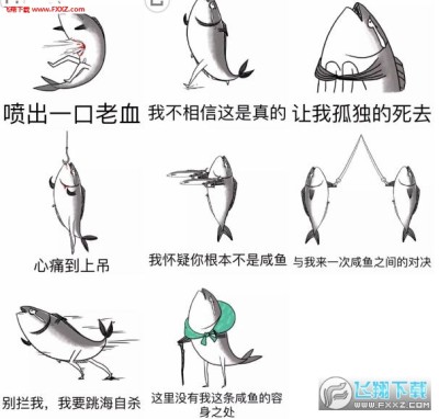 表情以咸鱼为形象,配上搞笑的台词,非常有意思,包括让我孤独地死去、喷出一口老血、心痛到上吊、别拦我我要跳海自杀、这里没有我这条咸鱼的容身之处、与我来一次限咸鱼之间的对决、我怀疑你根本不是咸鱼、我不相信这是真的等搞笑表情。