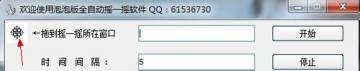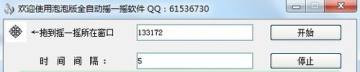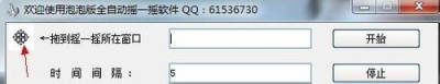 3、全自动摇一摇软件,一共就三个键。在左边,有个十字架标志,我们将他拖动到我们的模拟器上,这时,便会取得一个参数。注意:千万不要修改这个参数。下面是时间条件,控制你的摇一摇经过多少时间摇一次,我们默认5秒就好了。