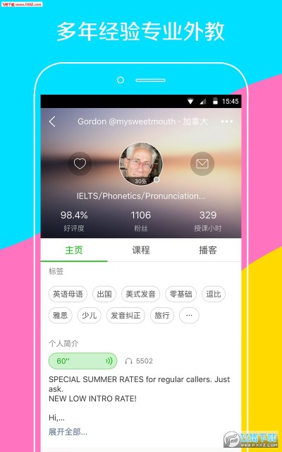 官方牛津少儿课程让孩子赢在起跑线,真人外教一对一,让孩子培养好的语感,汇聚中外优秀名师,多年经验专业外教,丰富课程满足各年龄段需求,快点来下载吧,让孩子开心学知识。一键找老师就在伴鱼少儿。口语爱好者的社区,帮你提升英语综合能力,长期雄霸教育类榜单,千万英语爱好者必备英语学习神器。