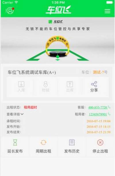 1.车位主用户可以通过APP控制自己的智能车位锁,管控自己的车位来进行停车,并可在车位闲置时发布出租信息带来收益,也可把车位分享给亲朋好友来使用。