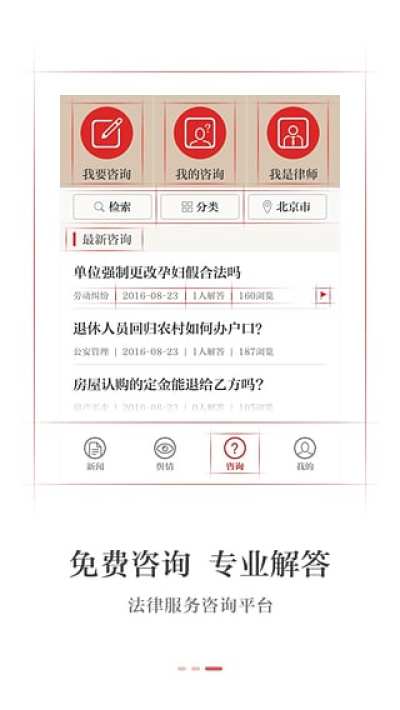 法制日报社面向广大市民提供一款免费的法律类服务的应用,通过手机媒介搭建专业、可靠、可信的法制服务与最终用户直接对接的新媒体桥梁。