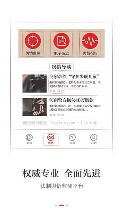 卖点:法治新闻发布平台、法制舆情监测中心、法律服务咨询平台