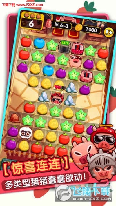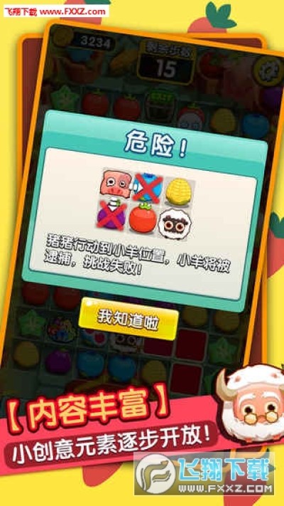 游戏中,小羊以自身为起点,连接两个相同水果可移动,连接4个以上可投掷炸弹进行攻击,连接水果越多,轰炸次数越多,以击败所有猪猪为过关目标。