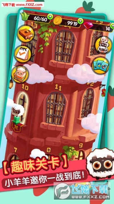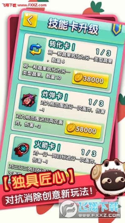 收集不同的水果可为不同的技能卡补充能量,当技能卡能量补满时,可进行技能释放。或轰炸猪猪,或提升行动次数,策略搭配才能让小羊连闯5关,顺利到达下一层!