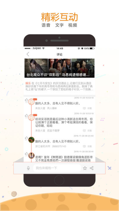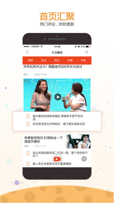 今日嘴炮是一款侧重于用户评论的新闻资讯APP,主要针对新闻和各大热点事件背后网友的精彩评论作细分及二次开发,并将评论直接作为显示主体,在内容上作二次筛选,将网友迸发出的奇特观点及智慧作推荐展示;在功能上我们加入语音视频等措施,增加用户的参与形式。让除去新闻本身,听到用户的另一种声音。