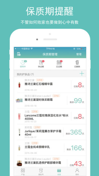 独家拥有60万条化妆品数据,让你轻松一扫加入管理清单让每一件美妆效期轻松管理。当添加的产品进入保质预警期会自动提醒您,再也不用担心化妆品过期带来的危害。