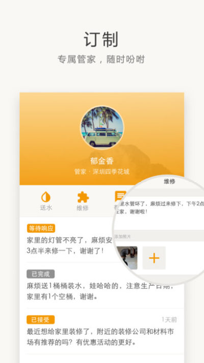 管家服务:与物业服务有关,提供住户的服务体验:服务请求线上受理(例如:维修服务、送水服务)、问题咨询、线上缴纳服务费、查询邮包、物业人员服务评价、房屋代租代售、访客邀请(扫码过门禁)等