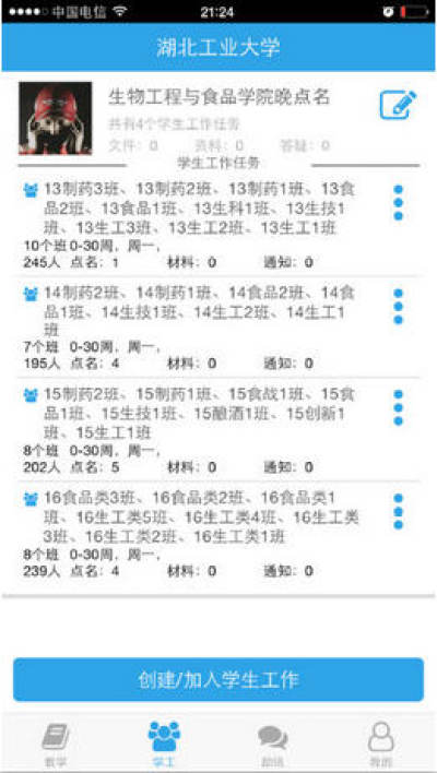 1、新增“学工”模块,方便班导师(班主任)及辅导员检查学生上课出勤、周末晚点名;