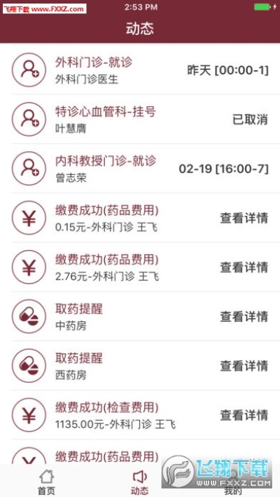 就诊记录:患者可在移动端查阅以往历史就诊记录,如:药品处方、检查、检验、治疗等。