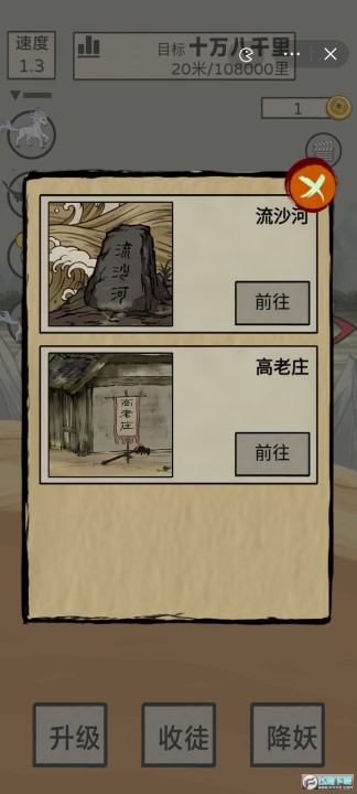 十万八千里是一款休闲小游戏,游戏内你的目标就是跑完108000里,点击跑完,点的越快,跑的越快。路上获得金币,可以提升速度,降妖收服坐骑,降服之后妖怪收编成你的坐骑,分别可以在当前速度上翻不同的倍数。