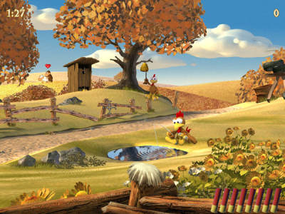 虽然是一款情节和操作都十分简单的射击游戏,不过一定会感觉到Phenomedia的有趣创意充满在游戏中,捅马蜂窝的敌人,幽闲的钓鱼者,蜗牛和打牌的刺猬,用铁锅档子弹的怪鸡都十分有趣。