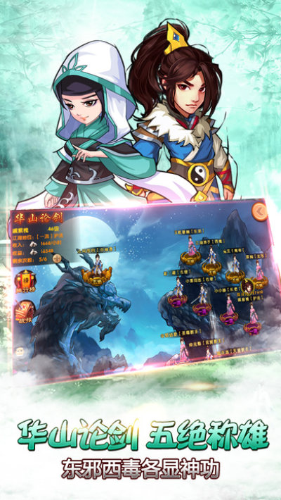 游戏可以通过【华山论剑】同台竞技,通过与玩家的争斗比试,经历不同江湖人的成长路线,逐渐从江湖小虾米成长为笑傲江湖的风云人物,甚至能够成为五绝,超越五绝,成为江湖中的一代传说。
