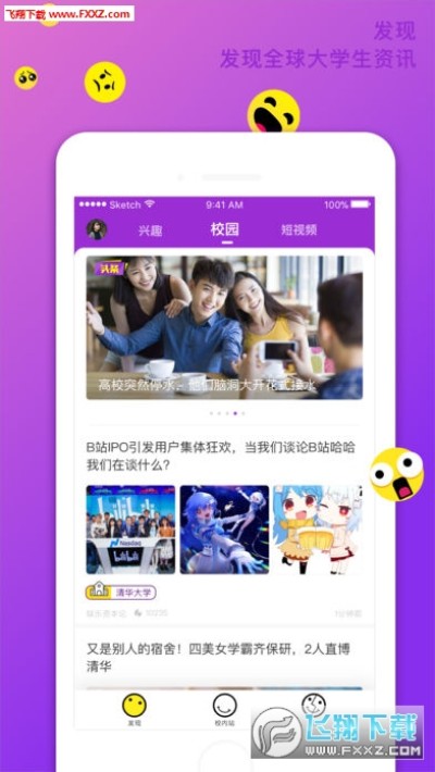 丰讯校园还提供娱乐、二次元、黑科技、创就、时尚、游戏、学习等贴近大学生的兴趣内容,以及全球有趣的短视频...