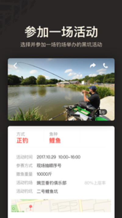 钓场作为钓鱼人的活动场所,钓场开通加入到微钓后,通过举办活动,与广大钓友们在线下亲密互动。钓友也非常方便的报名参加。一切活动举办和参加都变得那么容易!