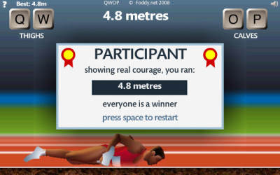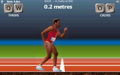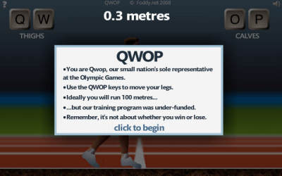 QWOP百米赛跑是一款极其坑爹的FLASH小游戏,游戏的困难程度令人发指。虽然游戏只是让你跑100米,虽然游戏只有QWOP4个按键,但是不要被这给蒙蔽了,无数的ACT高玩都死在了这款游戏上,不信你就试试吧!