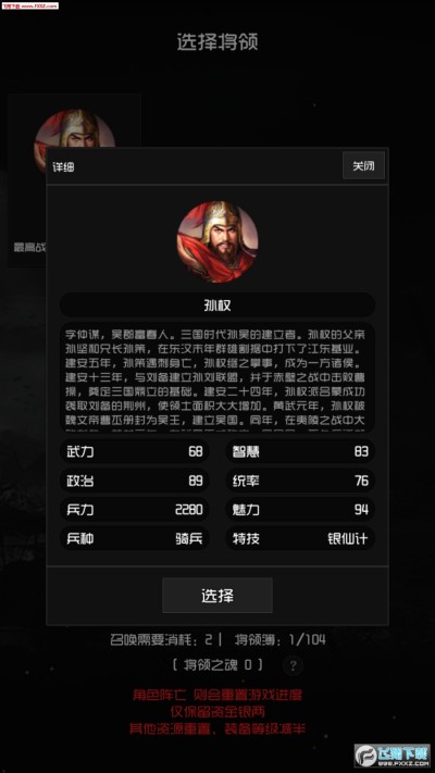 军神无双是一款以三国历史为题材的策略文字游戏。因为游戏是带有Roguelike元素的,因此游戏随机性很强,玩家每一次的游戏体验是不一样的。游戏里玩家开始是随机召唤属于自己的三国武将,然后发展壮大自己,获取更多的资源和兵力,以此来壮大自己的军队,帮助你参加战斗,取得各种战役的胜利。游戏里注意了一旦玩家兵力和人口均为0的时候,游戏就宣告结束了!