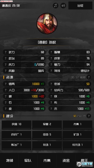 4,Roguelike元素,当人口和兵力为0,则游戏失败,会重置游戏,仅保留银两,其他所有资源、包括装备等级减半,输了就弃坑吧。