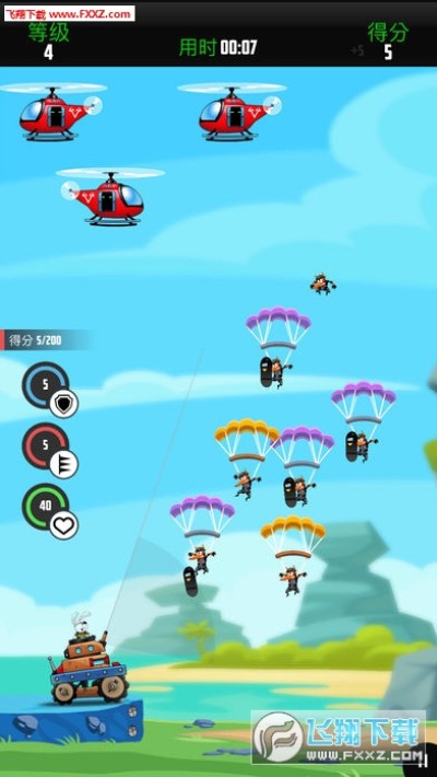 一个简单的、让人着迷且具有挑战性的游戏。您必须持续射击狐狸伞兵,阻止它们着陆。