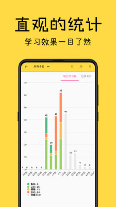 3. 智能制定复习计划,比你更懂你。 根据卡片学习的记住、模糊、遗忘及熟知。记录个人的遗忘曲线,在遗忘节点弹出复习。 分类卡包管理你的复习计划,随时查看不同类的卡包学新及复习进度;记一学习app提供各类数据线分别查看全部学习的数量、已学数量、需复习数量等等。让清晰真实的数据观察自己的进步和成就。
