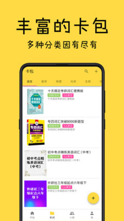 2. 快捷多变的卡片学习方式,360度学习知识点。 卡片编辑形式多元化,提供多种题型模板,反复练习,快速记住要点。 由知识点卡片组成卡包,放进你创建的小组内。你可以创建无数个不同类目的小组,小组内有无数卡包,卡包内有无数卡片。 由点及线,连成知识网络,随时增加修改知识卡片,让学习没有死角。并且全网分享卡包,知识不止一个点,资源不止一个方面。下载到本地进行更改,对原始卡片无影响。实现资源的自由化使用。