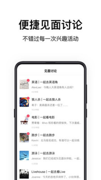线下见面:跑步、学英语、泡自习室、遛狗、撸、玩乐器、组乐队、做公益、看展览、玩摄影、看电影、K歌、逛街Shopping、寻找美食……再大的城市也能与美好相见。