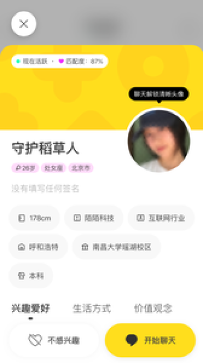 看脸很重要,但前提是聊得来。所有人的头像默认都是蒙脸效果的,需要通过聊天互动交换双方真实头像,你的样子只给聊得来的人看