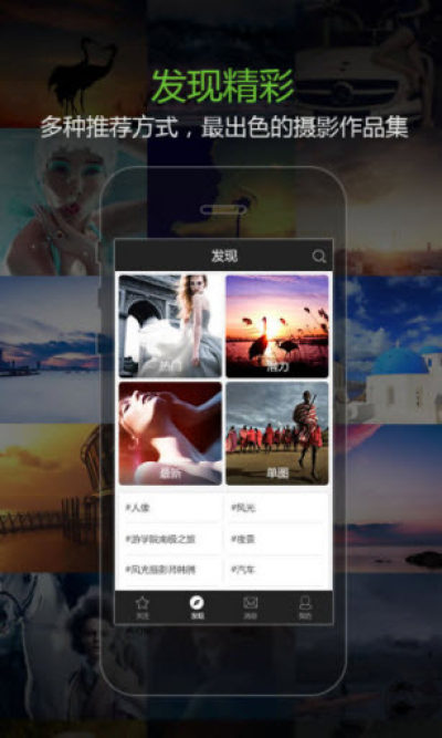 2.进入“发现”,随着您的指尖滑动,即可享受各类摄影作品,最新的,热门的, 上榜的,版主推荐的等各种浏览方式,
