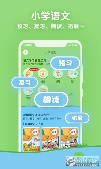 1.小学语文栏目:课文预习·复习·朗读,覆盖人教部编版小学语文的每一篇课文 - 在同步每一篇课文的预习音频和动画视频里,老师帮小朋友读通课文,学习字词,结合课后练习,学习每一篇课文的主要内容。小朋友还可以在APP里朗读每一篇课文,加背景音乐配音形成优美的朗读有趣配音作品,分享给老师和家长听。