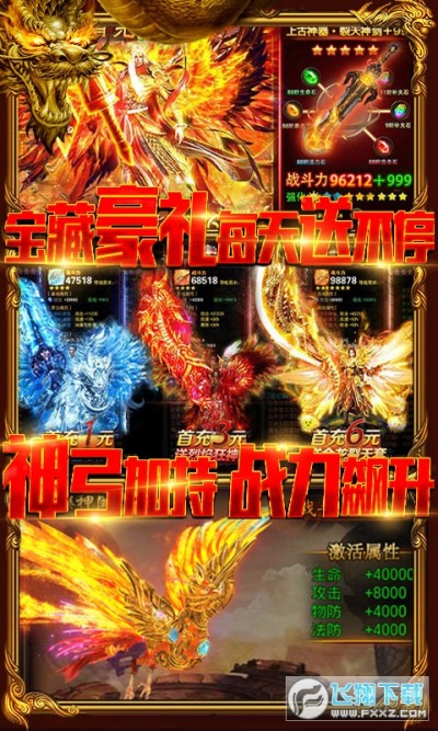 ★上线即送元宝18888,金币188万,vip13(开启千元充值礼包后直接满v),vip礼包免费领不停,更有远古神弓轩辕、落日等你来拿。