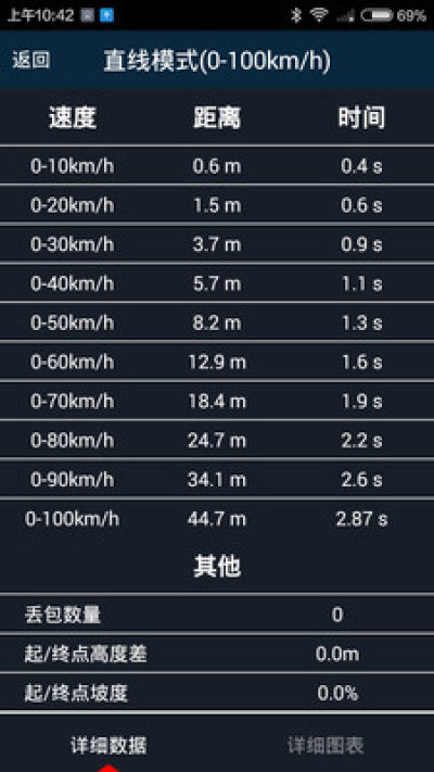 2:0-400米测试:与0-100公里/小时测试类似,测试汽车跑完400米所需要的时间。同样以丰富的图表方式展现0-100米200米 300米 400米所需要的时间及到达该距离的即时速度。并且以0.1秒为间隔绘制实时的速度、距离、加速度、时间曲线。