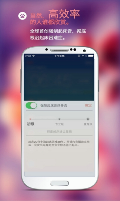 6、特别为“起床困难户”提供强制起床的铃音,让妈妈、女友放心的同时,也让老板放心;