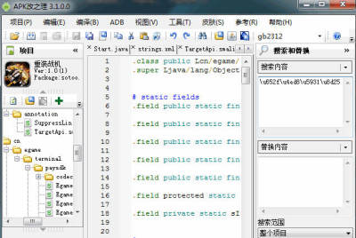 内置基于文件内容的关键字或多行代码段的搜索、替换引擎,一键搜索替换,搜索结果以标签的形式分门别类;允许在指定搜索范围(整个工程或选中的文件或文件夹内搜索),支持正则表达式搜索和替换。搜索功能是Apk修改的一个重要工具,从此你不必借助其它第三方搜索工具。