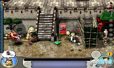 老头离开右下,到冰激淋机用BULLSHIT(巨佩服想出这个点子设计人员,恶搞无敌啊。。。)-〉到左下,在牛身上用军刀-〉到左上,在地上使用汽油-〉等老头下去后到右中,在下水道盖上使用火柴-〉到右上,用鼓风机吹旺炭火,用石棉内裤包点炭火,把汽油倒到水盆里-〉回中上,躲到篓子里,等老头脱鞋进去参拜的时候把炭火放到拖鞋里,再躲到篓子里就OK了