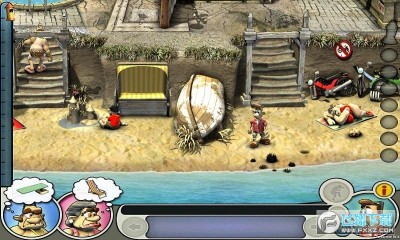 在物品都到手后,在老头跳水后,到跳板,使用弹簧-〉老头到右下后,到右上,在大象旁放下装满水的水桶-〉老头到左下,到右下,在海螺上使用螃蟹,然后再夹一只螃蟹-〉到左下,在小孩城堡放螃蟹,在毯子上放海胆-〉到左上,在遮阳篷的架子旁使用摩托脚踏,收起棚子,然后到跳板旁拿回弹簧再装上-〉到右上看好戏~