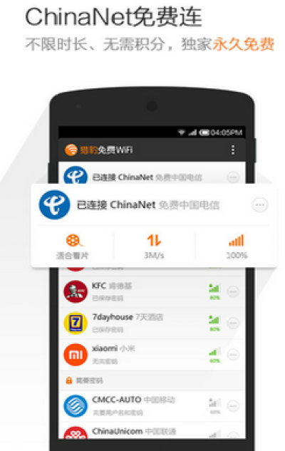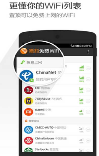 猎豹免费WiFi是一款最好用的手机免费上网神器,软件具有ChinaNet热点免费连、wifi安全体验和一秒找到免费wifi等功能。独家支持永久免费连入ChinaNet热点,不限时长、无需积分、自动登录,真正做到手机免费上网!