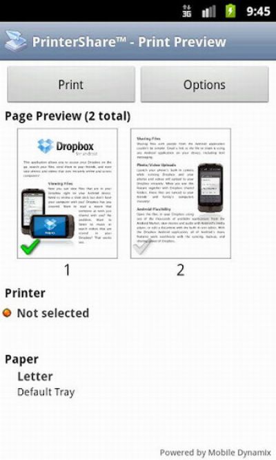 PrinterShare(移动打印):是一款手机上的打印管理软件,可以从您的手机直接打印SD Card中的档案(DOC,DOCX,XLS,XSLX,PPT,PPTX,PDF,TXT)和Google文件,Gmail,照片,通讯录,行事历,简讯/MMS, 通话记录及网页到你旁边或世界任何地方的打印机。它是一个独立的小应用程式,只是要给解锁手机的高级功能。