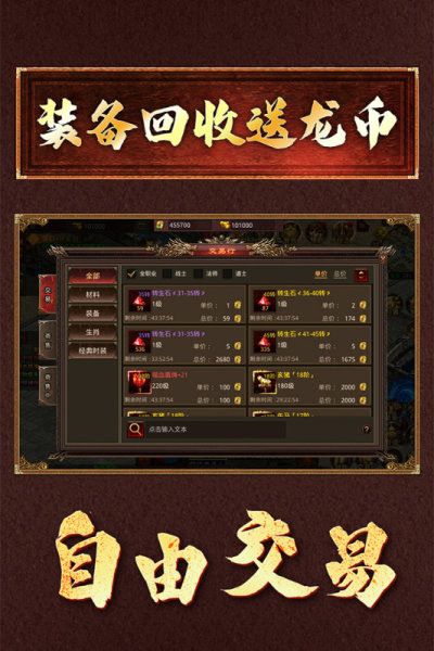自由交易无限制,更有超公平的交易系统。在游戏里打出来的各种装备,都能够在交易行中进行交易。 自由交易不仅可以快速的找到所需资源,也可通过打怪爆装来实现变强的“小目标”,体验交易赚钱的乐趣!