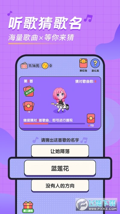 猜歌领福利是一款有趣的音乐类应用,根据应用播放的音乐片段来猜出歌名。流行、摇滚、抒情等不同曲风的歌曲等你来挑战,赶快和你的朋友们一起来答题吧。