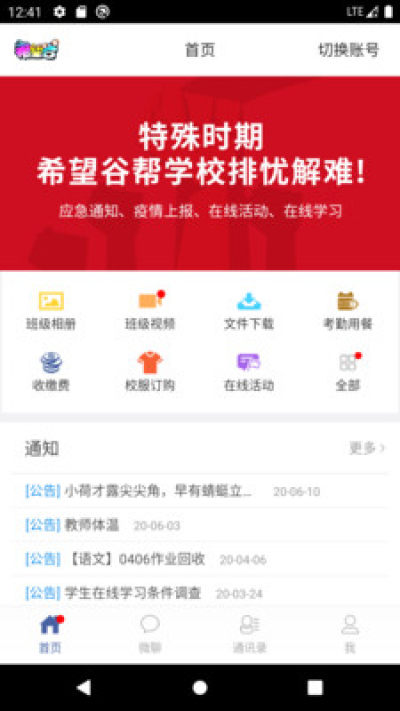 通知:向全校或全班的教师、家长、学生及群组发布各种信息,如公告、作业、成绩、光荣榜等。