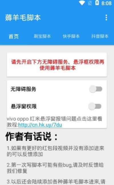 安卓薅羊毛脚本app是一款多功能的自动看短视频脚本辅助。大家都会在短视频极速版看视频赚零花钱,但人手去刷视频浪费人力资源,为了解决人眼去手动刷极速版视频赚零花钱问题,本短视频薅羊毛脚本app功能超级好用,提供超级好用的自动刷视频领红包,各种极速版短视频刷刷刷,还有一键领取各种红包优惠,安全稳定防封号,大家放心使用薅羊毛脚本,免得你费时费力去自己操作,好用还省心,不管是哪一方面的羊毛信息这里都带你薅定了。