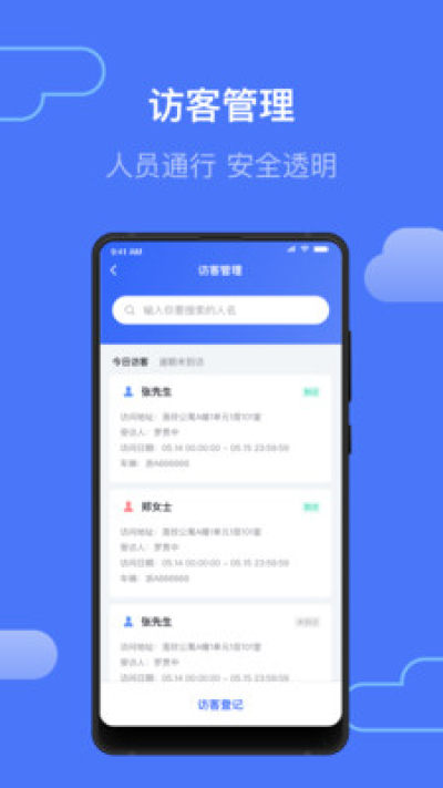 - 访客管理,访客通行无纸化登记;