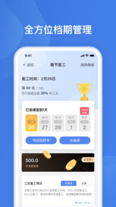 根据工地要求,快速高效完成日常上工档期预设及打卡签到,记录工作细节,并及时分享给施工相关人员。