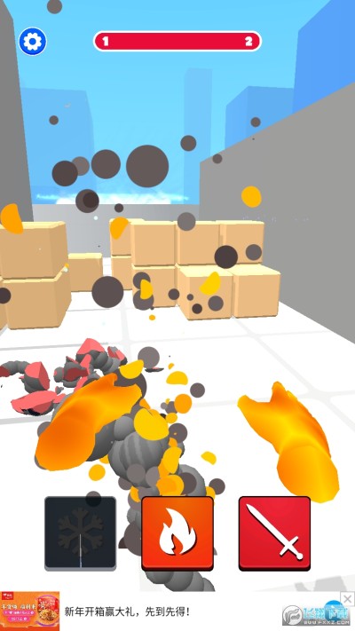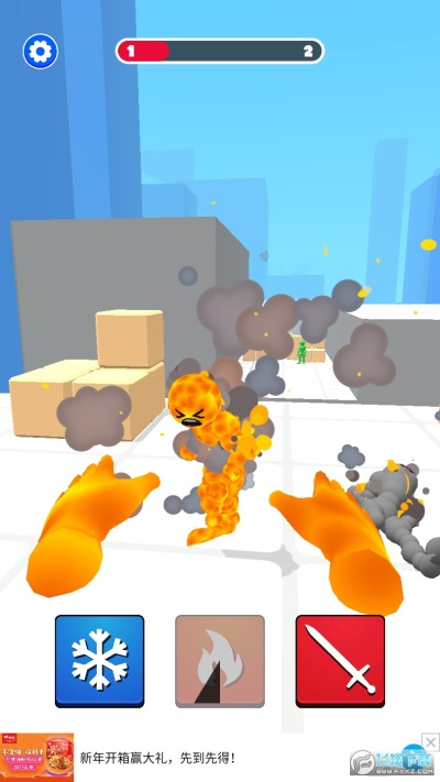 1、炫酷的魔法技能,多种属性的魔法攻击,紫色的火焰小球点燃对方的木桩,白色的冰晶魔法冻住敌人的行动。