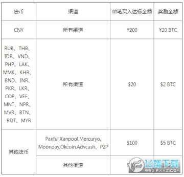 购买数字货币任务: 使用法币购买数字货币的单笔订单金额达标后,可领取比特币奖励。使用不同国家法币、通过不同渠道买入时,任务达标金额和奖励不同。任务将可能动态调整,以下参数仅作为参考: